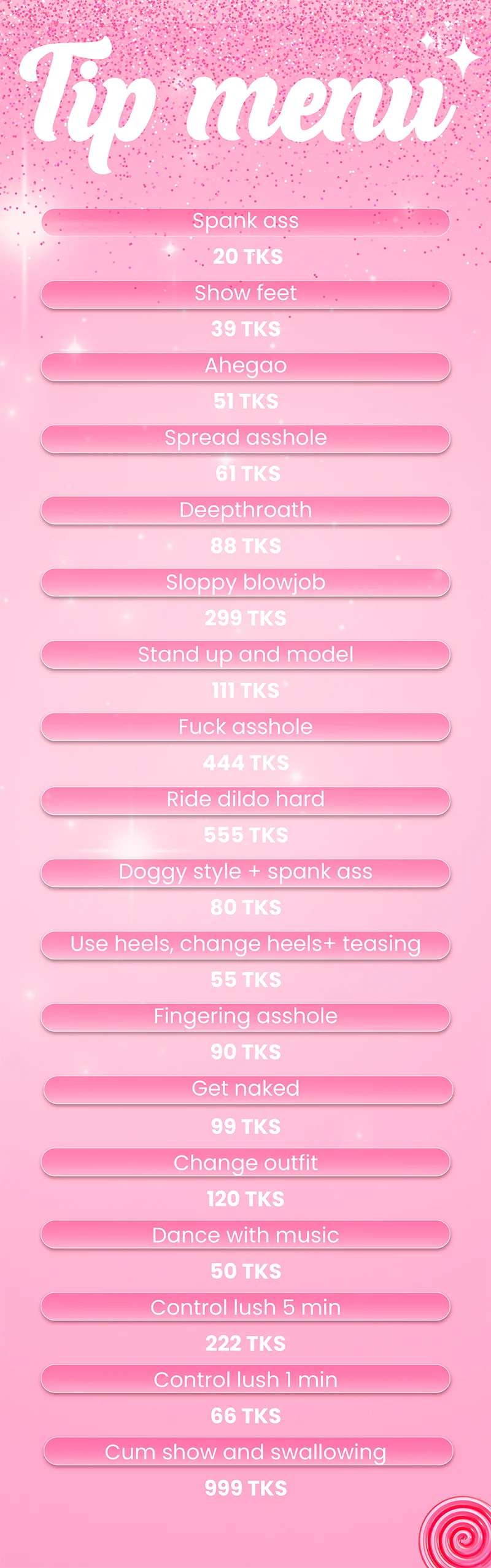 Op z'n Hondjes, Ahegao, Spanking, Dildo of vibrator, Roken, Facesitting, Seksspeeltjes, Pijpen, Massage, Tietneuken, Kokhalzen, Twerken, Erotische dans, Pik beoordeling, Vingeren, Dirty Talk, Facial, Voetfetisj, Striptease, Rollenspel, Anale speeltjes, Deepthroat, Vernedering, Olie show, SPH, Orgasme, Masturberen, Kont naar mond, Cumshot, Leer, Handjob, Anaal, Ejaculeren, Slikken, Cowgirl